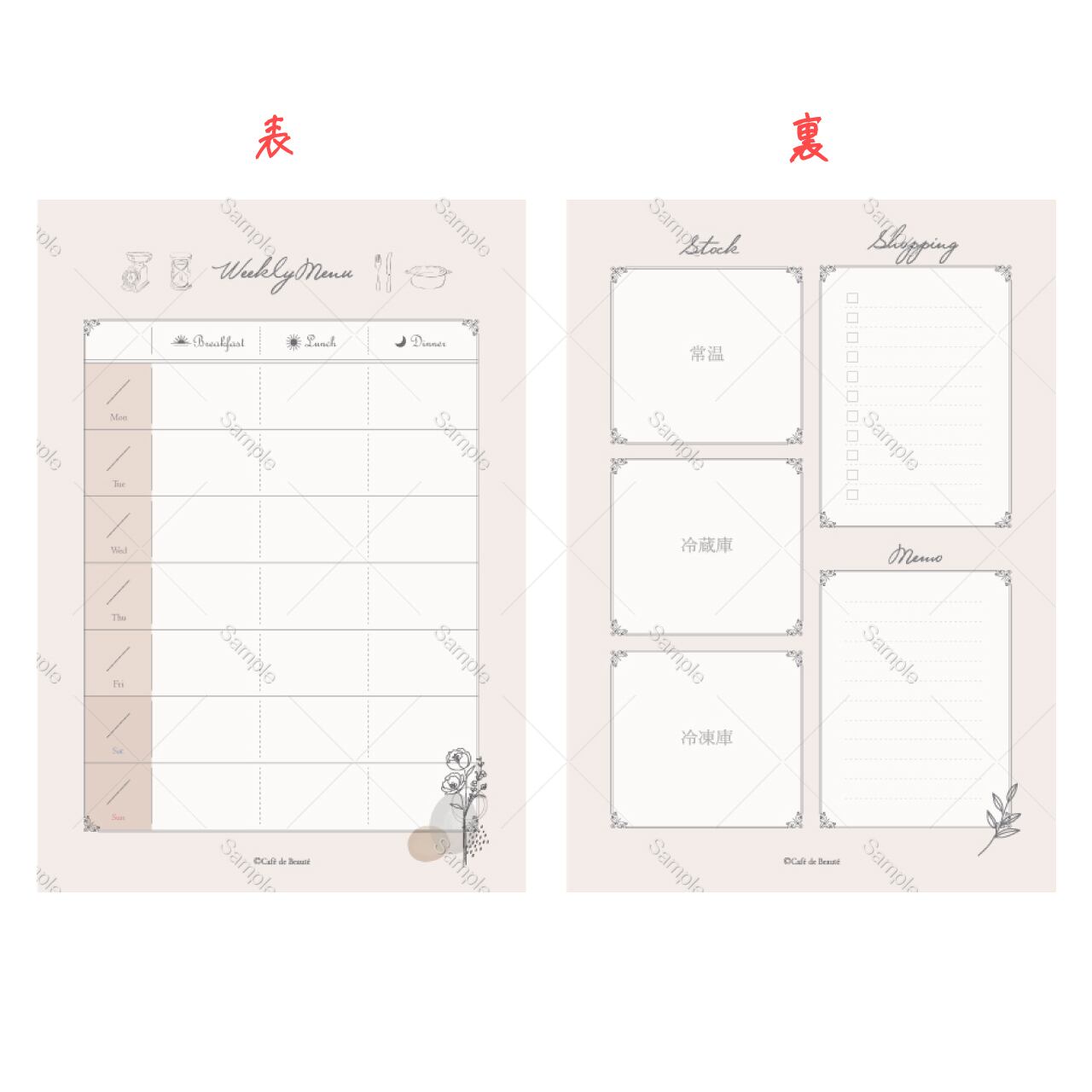 一週間分のメニュー表を朝、昼、夜別に記入できます。